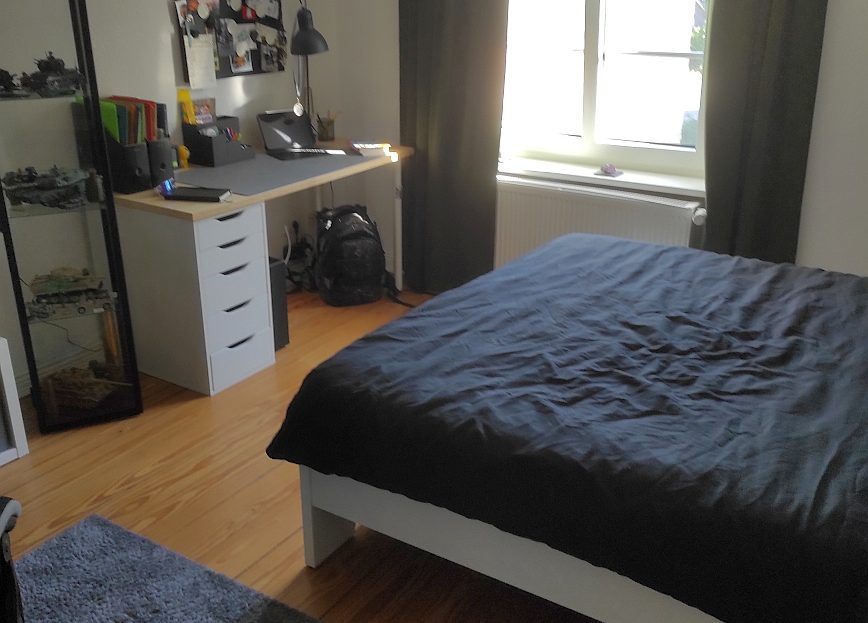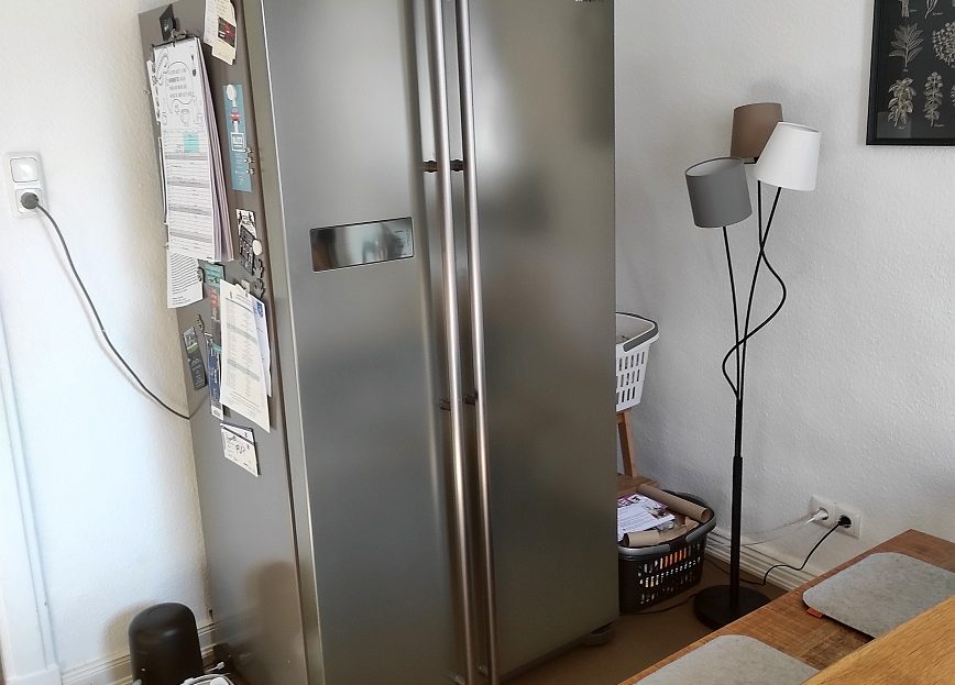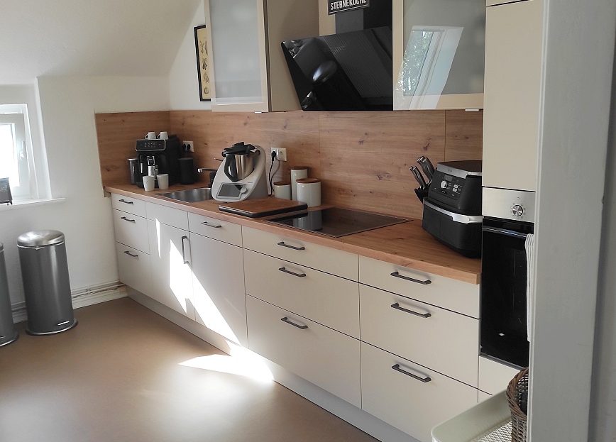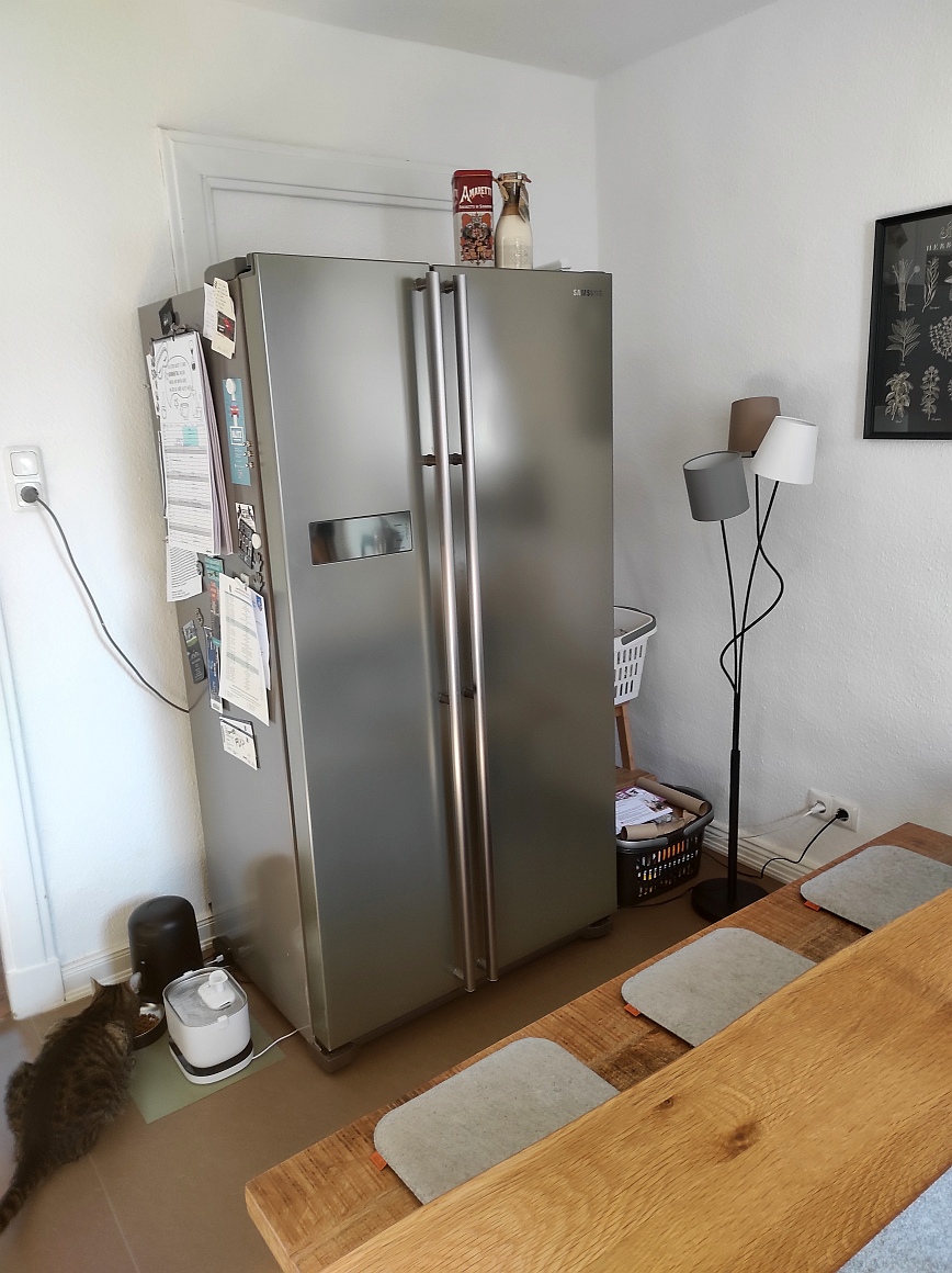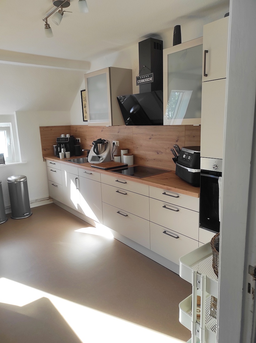 Die Einbauküche ist in 2025 neu eingebaut worden; der Kühlschrank (side by side) kann vom jetzigen Mieter übernommen werden.